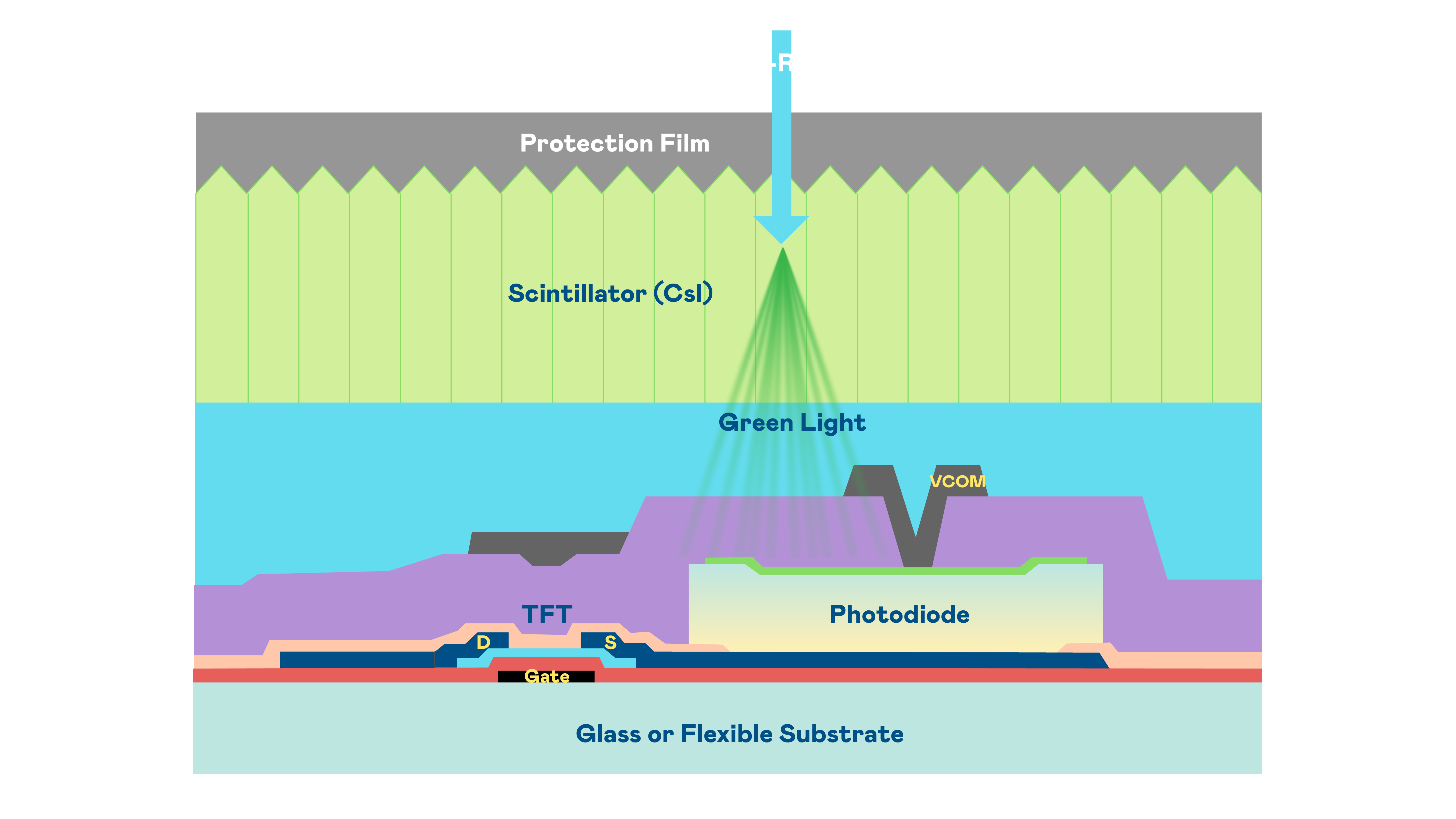极速3D的X光影像感测阵列使用薄膜电晶体 (TFT) 作为每个像素的读取开关,搭配光电二极体(Photodiode)的光电转换元件,用以感测X光影像讯号。